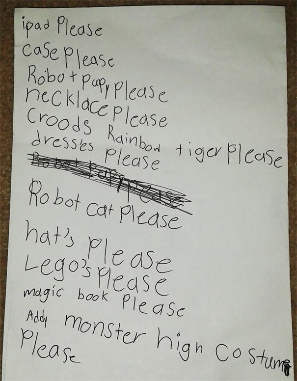 As we grow up, our parents teach us all about manners; mostly, they teach us to say “please” and “thank you” – the basics of having manners, those are the magic words if you want something from someone else. This girl has mastered her manners, and now she’s practicing her skills in her letter to Santa.