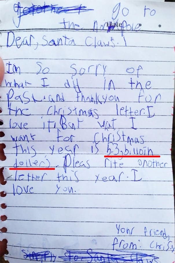 Forget about “All I want for Christmas is you” – all this kid wants for Christmas is 53 billion dollars. We can’t tell if it says 5.3 billion or 53 billion, but either way, it seems a bit unrealistic, doesn’t it? Also, he thinks that if he apologizes for what he did in the past, Santa would just give him 53 billion dollars? What does he think Santa does for a living?