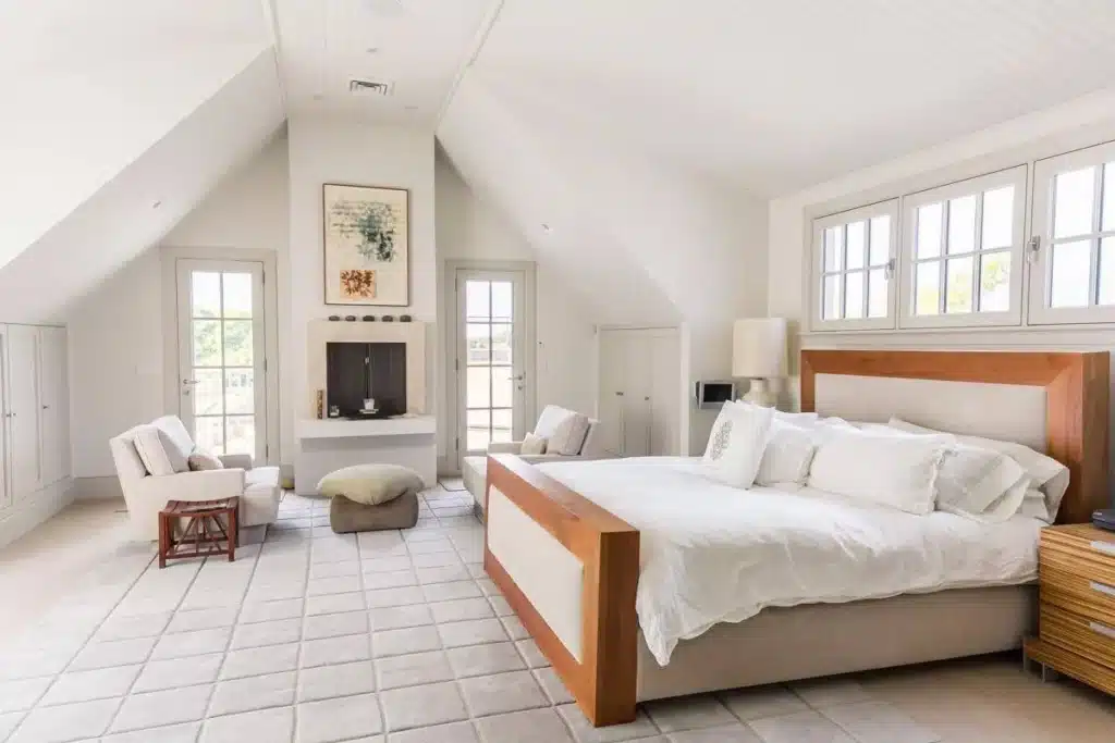 Climb the winding stairs to discover the master bedroom, a true sanctuary of elegance and calm. A plush king-size bed is at its heart, inviting you to unwind in unmatched comfort. A sleek, modern fireplace stands nearby, ready to cast a cozy glow on chilly evenings.