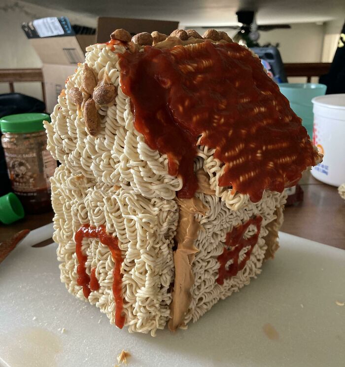 While this may not be a traditional gingerbread house, it’s certainly original. Who knew that chili garlic sauce, mixed nuts, and peanut butter could go so well together? We sure didn’t see that coming. Next thing we know, this person is going to be making little gingerbread people out of dried ramen, too.