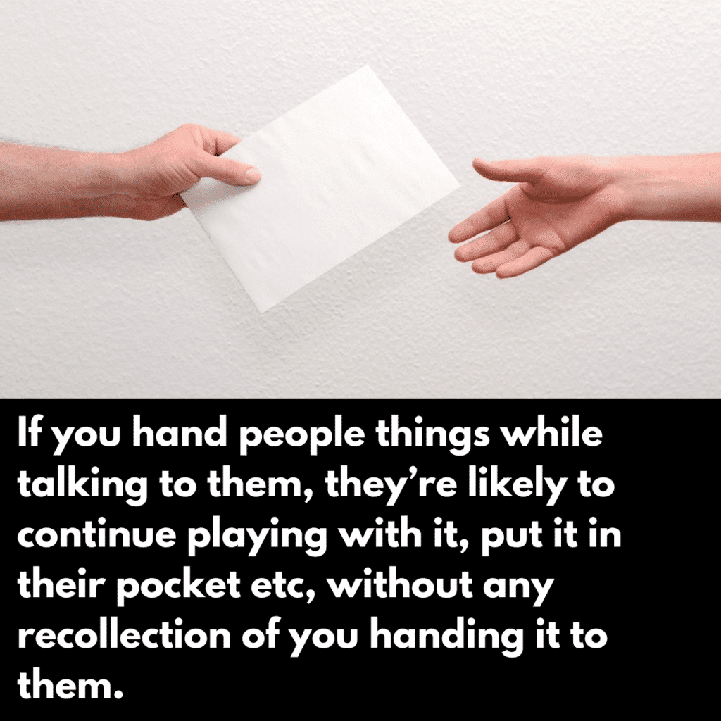 This is one that I’ll have to see in order to believe. The logical basis for it seems sounds but it just seems somewhat hard for me to believe that people take no notice of the object being placed in their hands – and mainly because most of us are never fully concentrating on the conversation anyway.