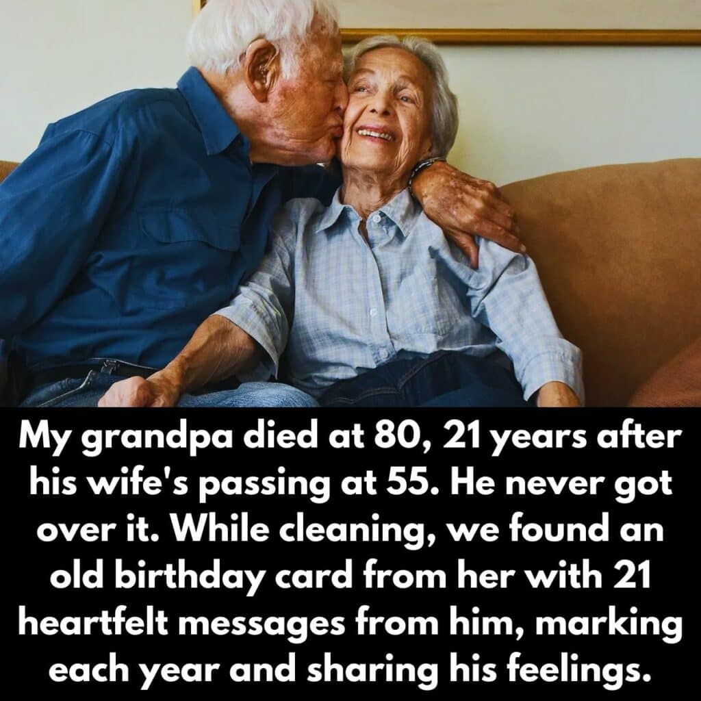 This person’s grandpa passed away at 80 and spent the last two decades of his life alone, as his wife passed at the age of 55. As they were cleaning out his home, they found an old birthday card she’d given him a few months before her passing. On the back of the card, his grandpa wrote the date and the year of his new birthday each year, with a different small note, sharing his feelings with her.